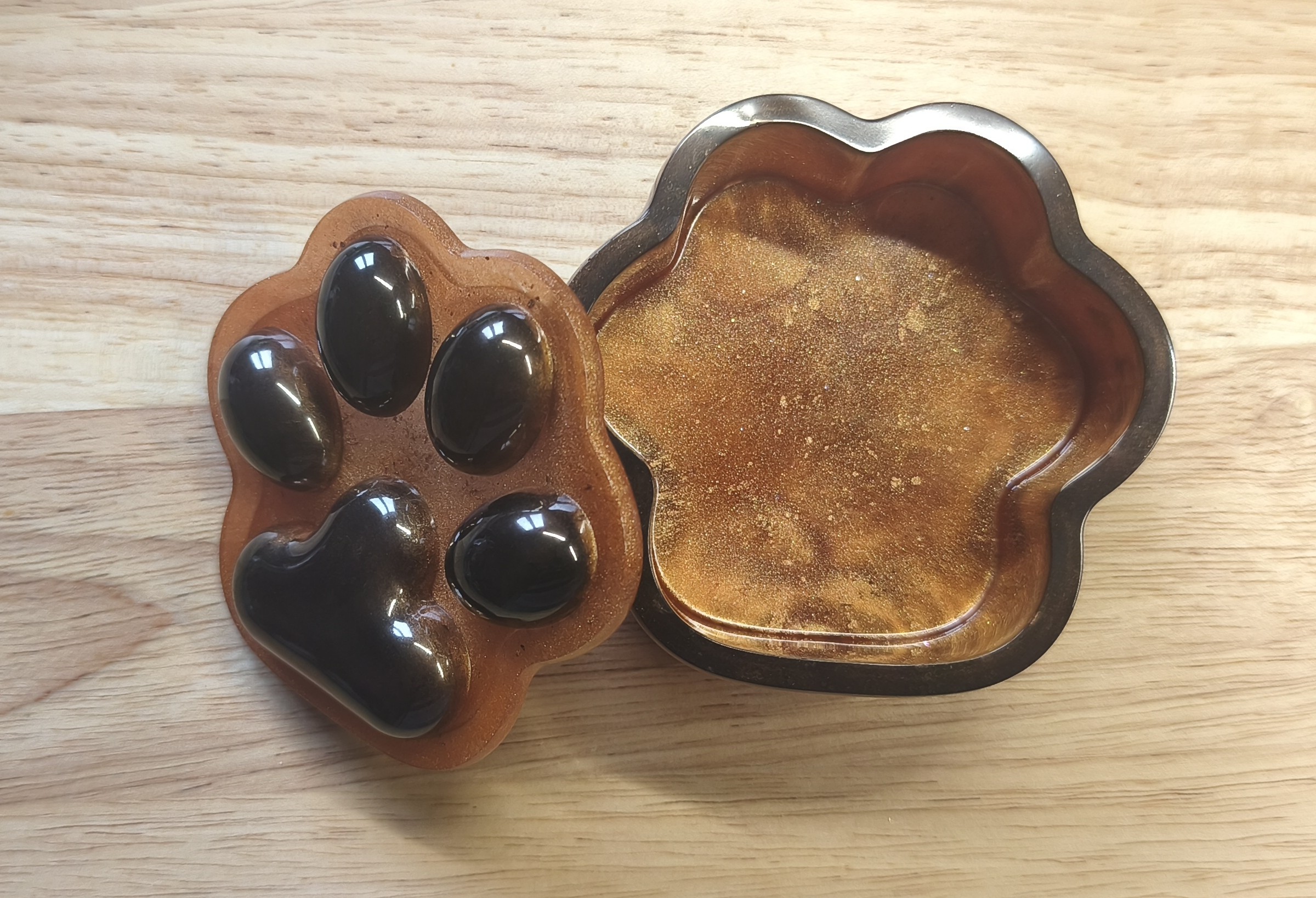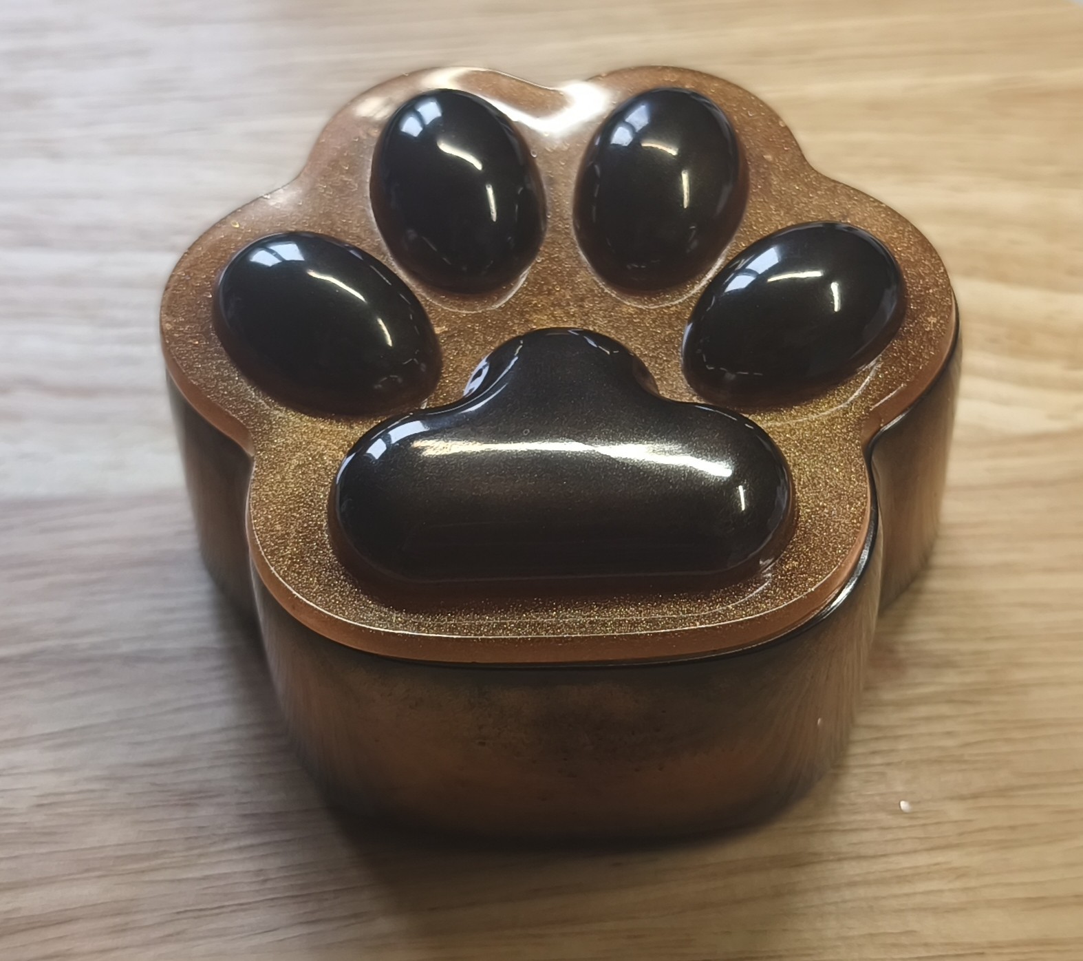 Cette boîte en forme de patte au dimensions de 9 cm x 8 cm et 4 cm de hauteur, fait en résine époxy est pratique, original et idéal pour déposer vos bijoux, clefs, petits accessoires.