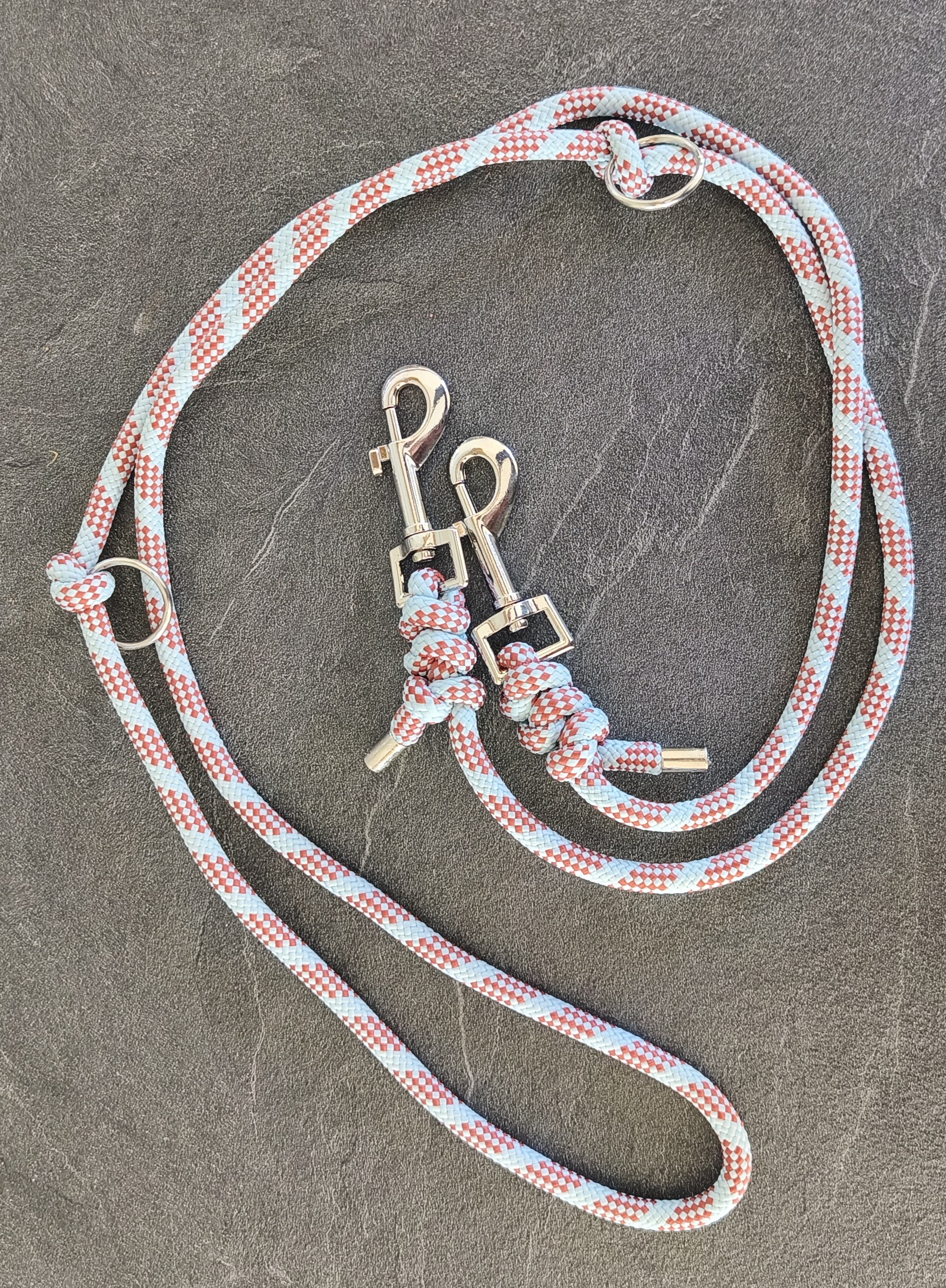 Les laisses sont faits à la main en corde de Ø 8 mm , avec deux anneaux de réglages qui peuvent se défaire et s'ajuster à la longueur que vous souhaitez. Elles sont confortables , idéals pour vos balades en compagnie de votre chien.